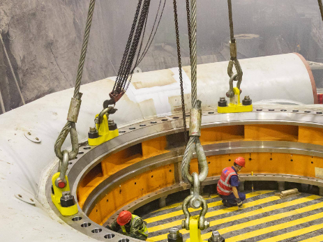 隨著起重設備的緩緩運作,鋼絲繩索具穩穩地牽引著龐大的蝸殼,按照預設路徑精準移動至安裝位置。整個過程中,索具始終保持穩定的受力狀態,憑借其強大的承載能力和可靠的性能,完美配合施工團隊完成了這一關鍵步驟,為水電站后續的順利建設奠定了堅實基礎。